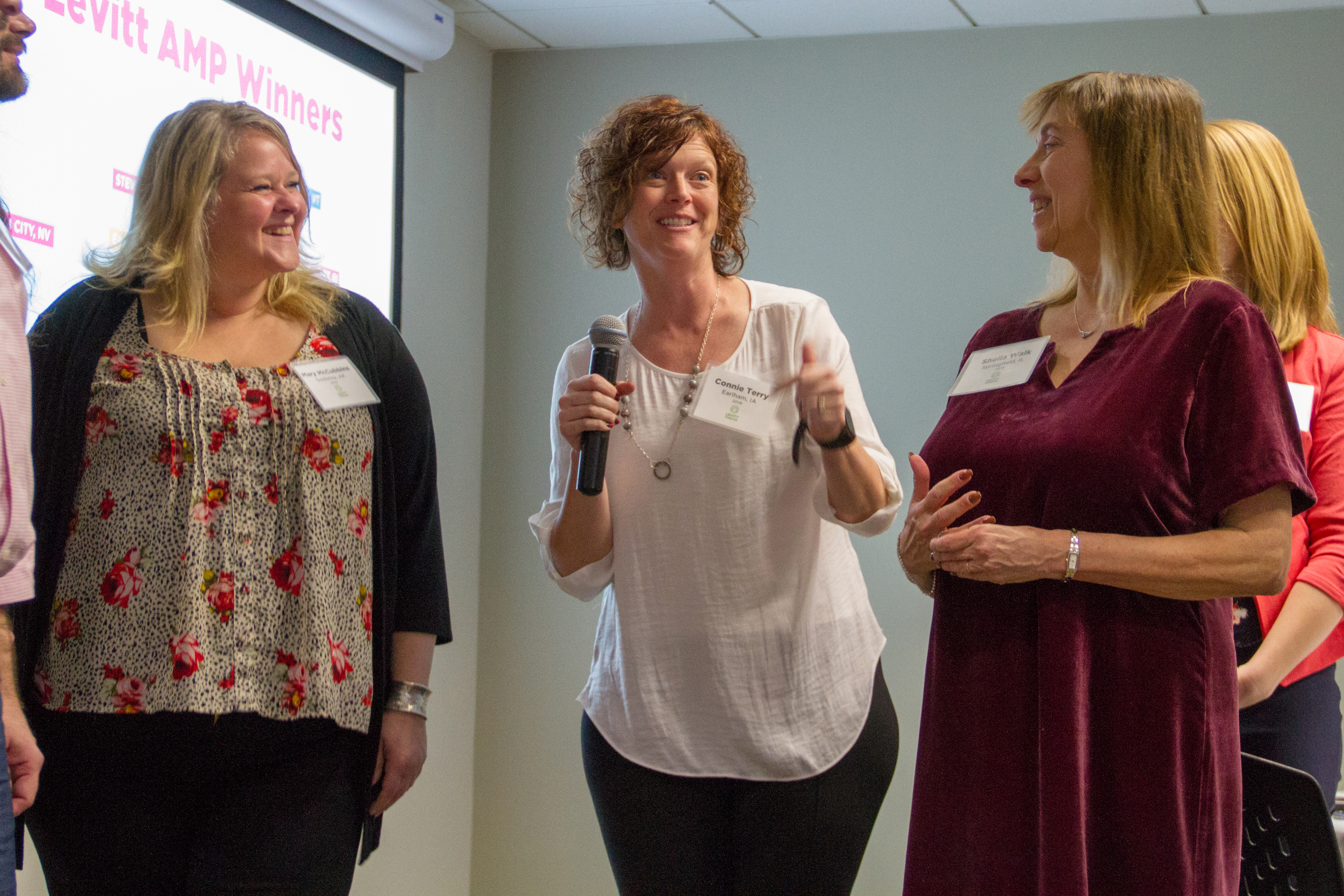 Grantees began the 2019 Levitt AMP Convening with an introductory activity. From left to right: Mary McCubbins (Vision Soldotna, Soldotna, AK), Connie Terry (Earlham Chicks with Checks, Earlham, IA) and Sheila Walk (Springfield Area Arts Council, Springfield, WI).