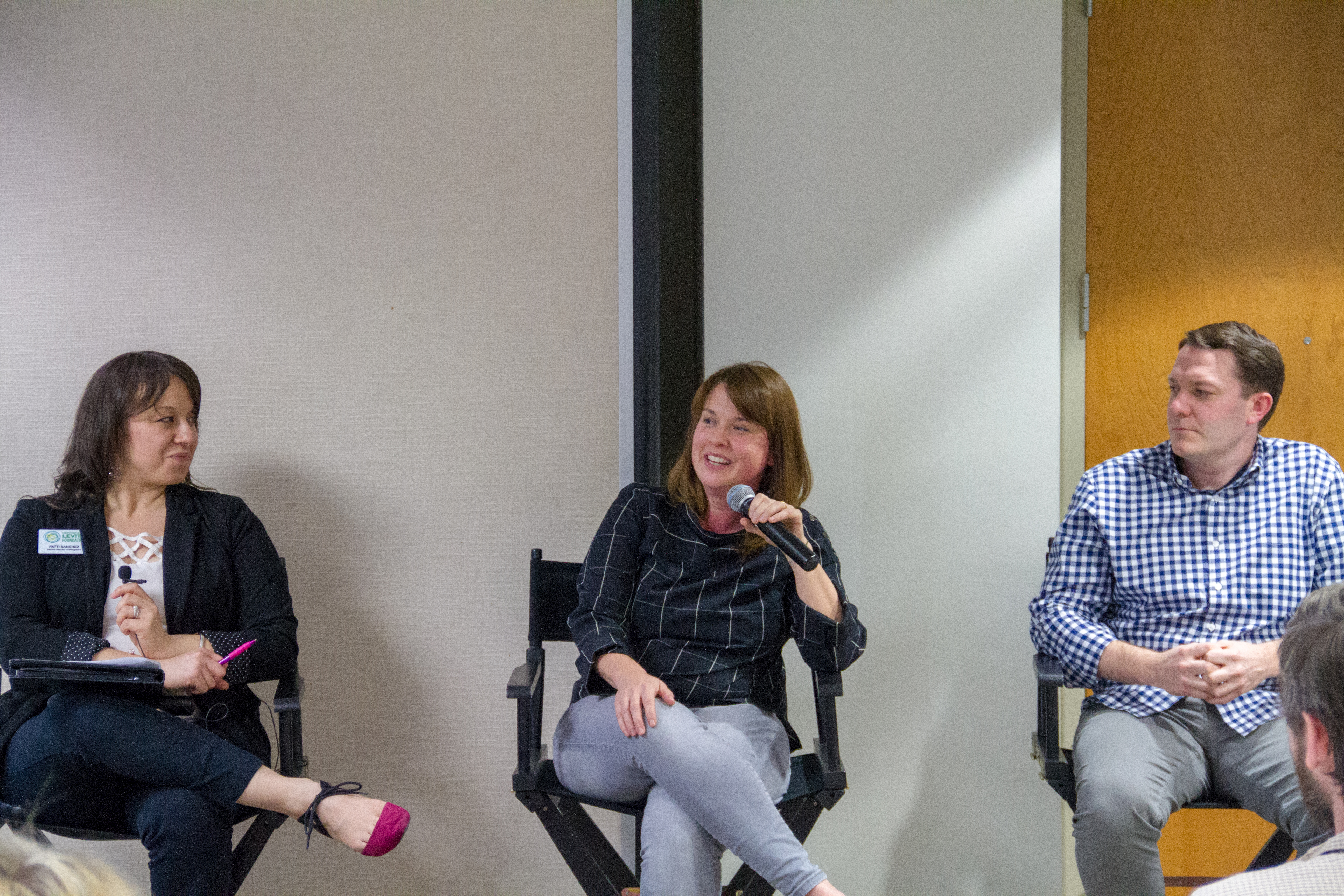Patti Sanchez (Levitt Foundation Senior Director of Programs) moderates a panel on programming and booking talent with Cindy Cogbill (Director of Programming & Marketing, Levitt Shell Memphis) and Patrick Brogan (Chief Programming Officer & Manager of ArtsQuest Center).