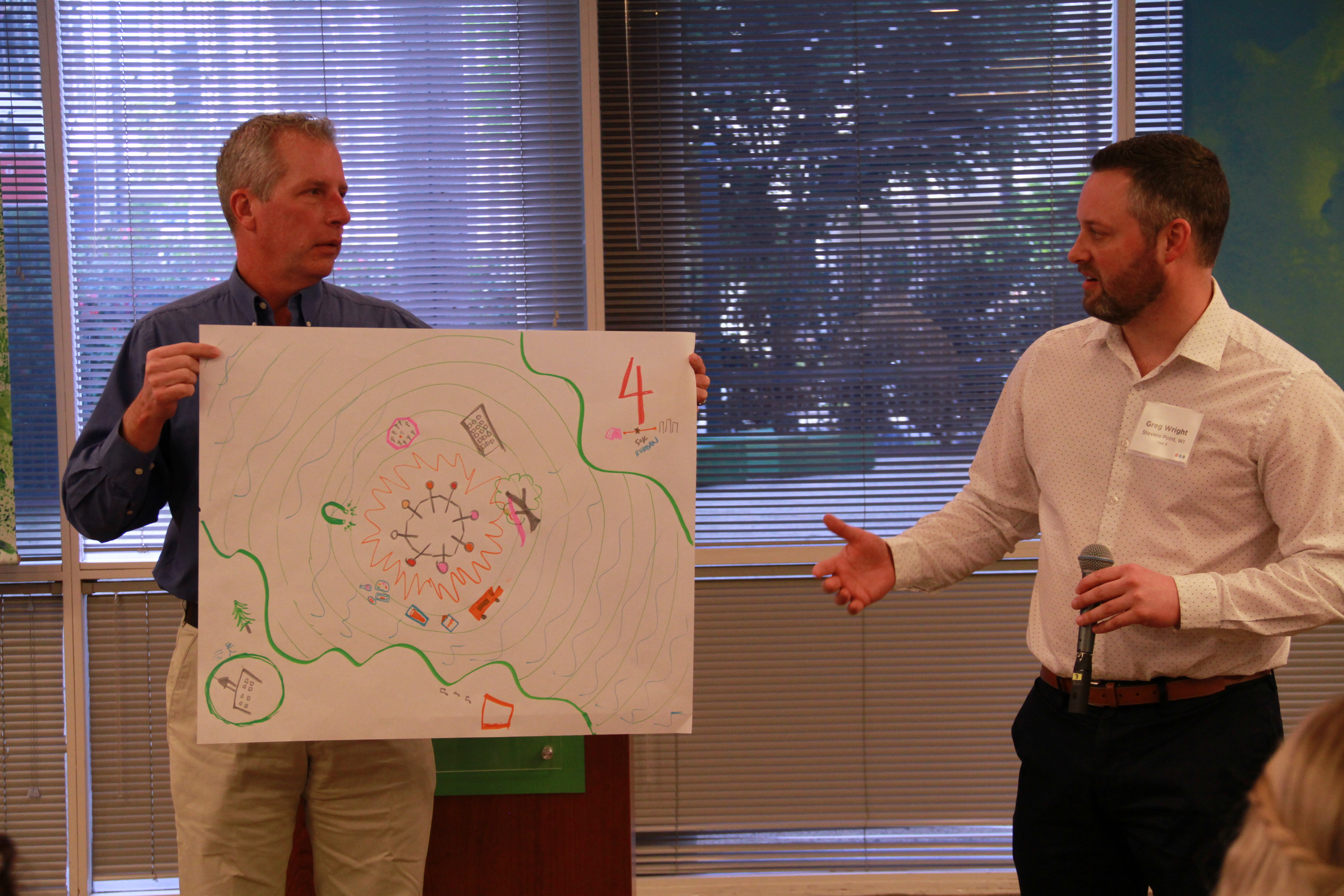 IMG_8976 ← Previous Next → (L to R) Greg Diekroeger and Greg Wright (both of Stevens Point, WI), show off a colorful depiction of their central Wisconsin community.